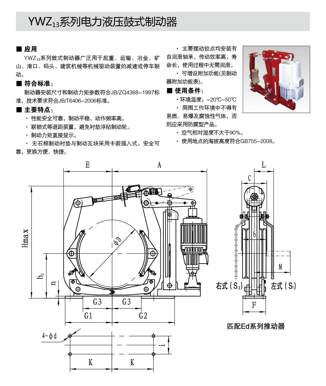 YW,YWZ13系列電力液壓鼓式制動(dòng)器的連接尺寸和技術(shù)要求符合JB / T6406-2006標(biāo)準(zhǔn);制動(dòng)力矩參數(shù)符合DIN15435標(biāo)準(zhǔn),配套符合DIN15430標(biāo)準(zhǔn)的Ed系列推動(dòng)器。