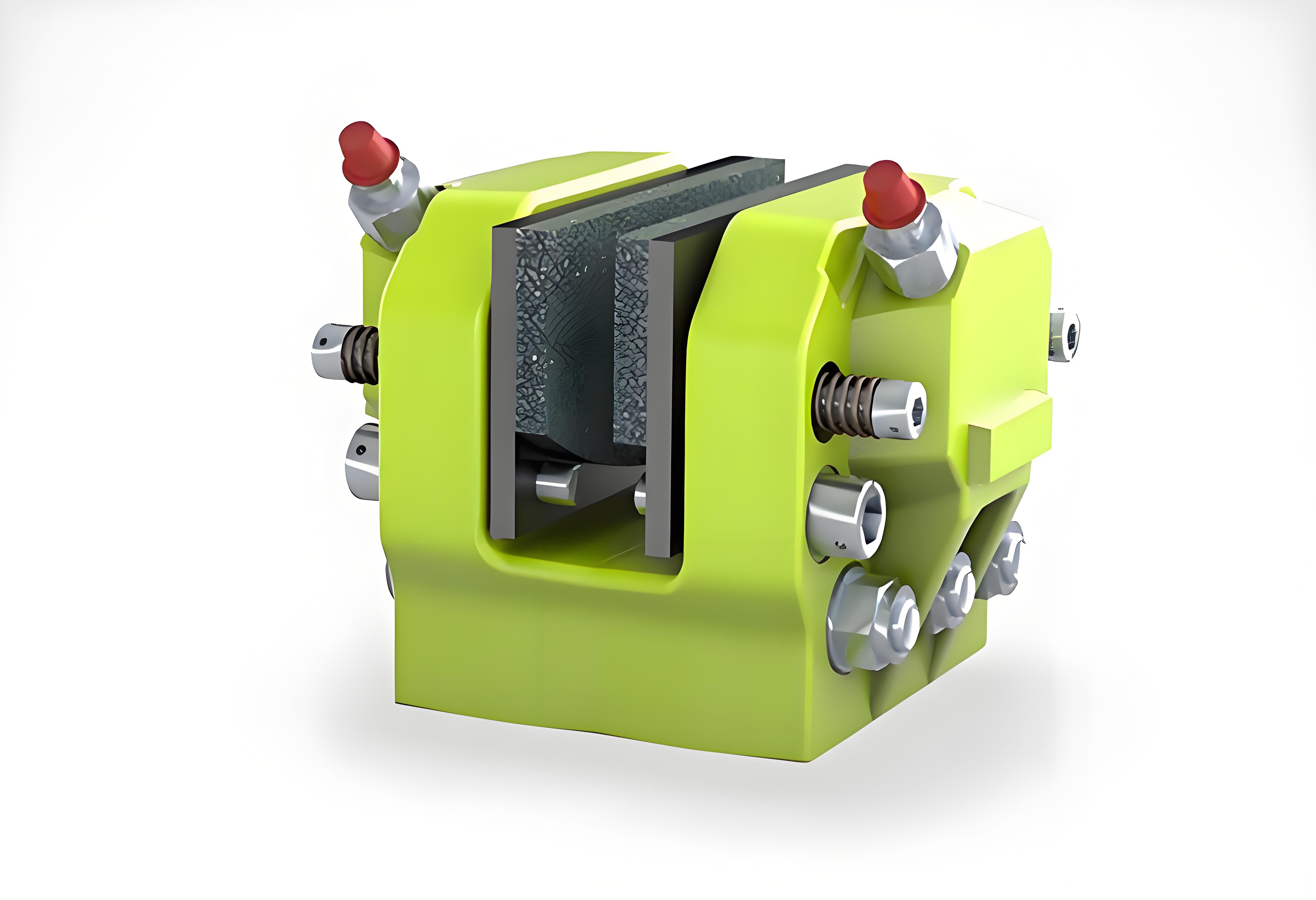 盤(pán)式制動(dòng)器SKD35-50-65-80由完全對(duì)稱兩部分組成。制動(dòng)器每一側(cè)設(shè)計(jì)有兩個(gè)導(dǎo)位銷,可以有效的將來(lái)自摩擦片上受到的切向制動(dòng)力傳遞到制動(dòng)器本體和安裝支架上,因此確保制動(dòng)器活塞部分可以不受任何徑向力的影響從而大大延長(zhǎng)制動(dòng)器整體的可靠性和使用壽命。當(dāng)加載壓力釋放時(shí),制動(dòng)器每一對(duì)稱部分的兩個(gè)復(fù)位彈簧將摩擦片脫開(kāi)制動(dòng)盤(pán)并復(fù)位。摩擦片的磨損可通過(guò)增加活塞行程進(jìn)行自動(dòng)補(bǔ)償。SKD系列工作制動(dòng)器需對(duì)應(yīng)標(biāo)準(zhǔn)厚度的制動(dòng)盤(pán),非標(biāo)準(zhǔn)厚度可通過(guò)選擇相應(yīng)的墊片。SKD適用于任何需要?jiǎng)討B(tài)制動(dòng)、靜態(tài)鎖