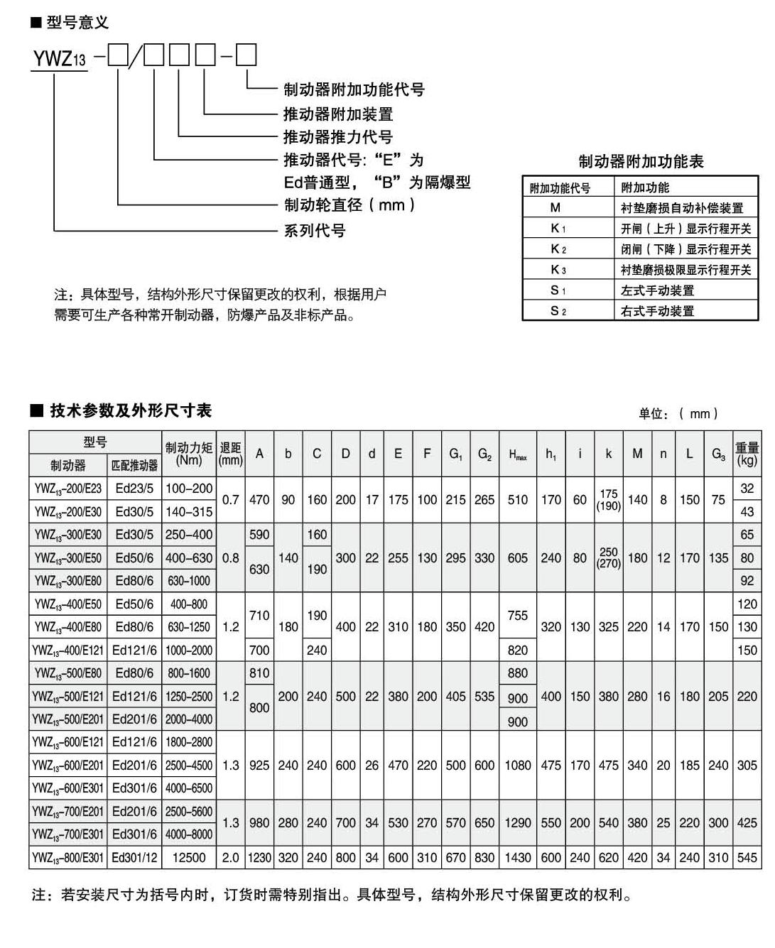 YW,YWZ13系列電力液壓鼓式制動(dòng)器的連接尺寸和技術(shù)要求符合JB / T6406-2006標(biāo)準(zhǔn);制動(dòng)力矩參數(shù)符合DIN15435標(biāo)準(zhǔn),配套符合DIN15430標(biāo)準(zhǔn)的Ed系列推動(dòng)器。