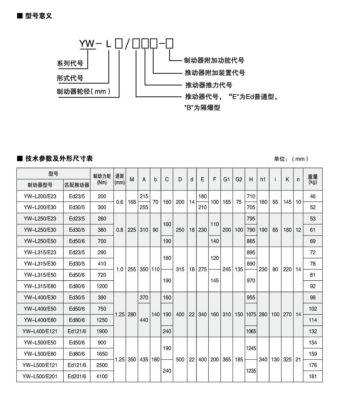 YW-L系列制動(dòng)器連接尺寸及制動(dòng)力矩參數(shù)符合JB/T6406-2006標(biāo)準(zhǔn)和DIN15435標(biāo)準(zhǔn)。配套符合DIN15430標(biāo)準(zhǔn)的Ed系列推動(dòng)器。